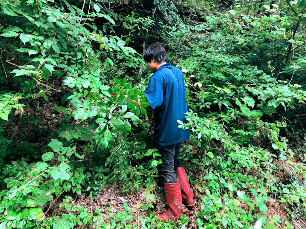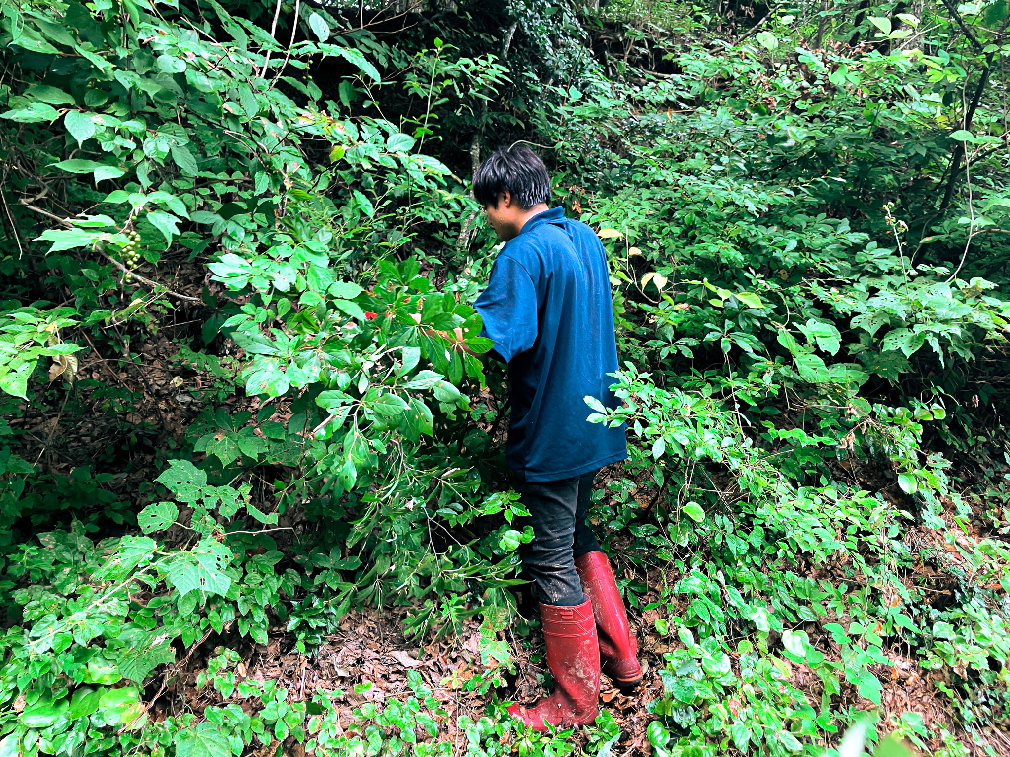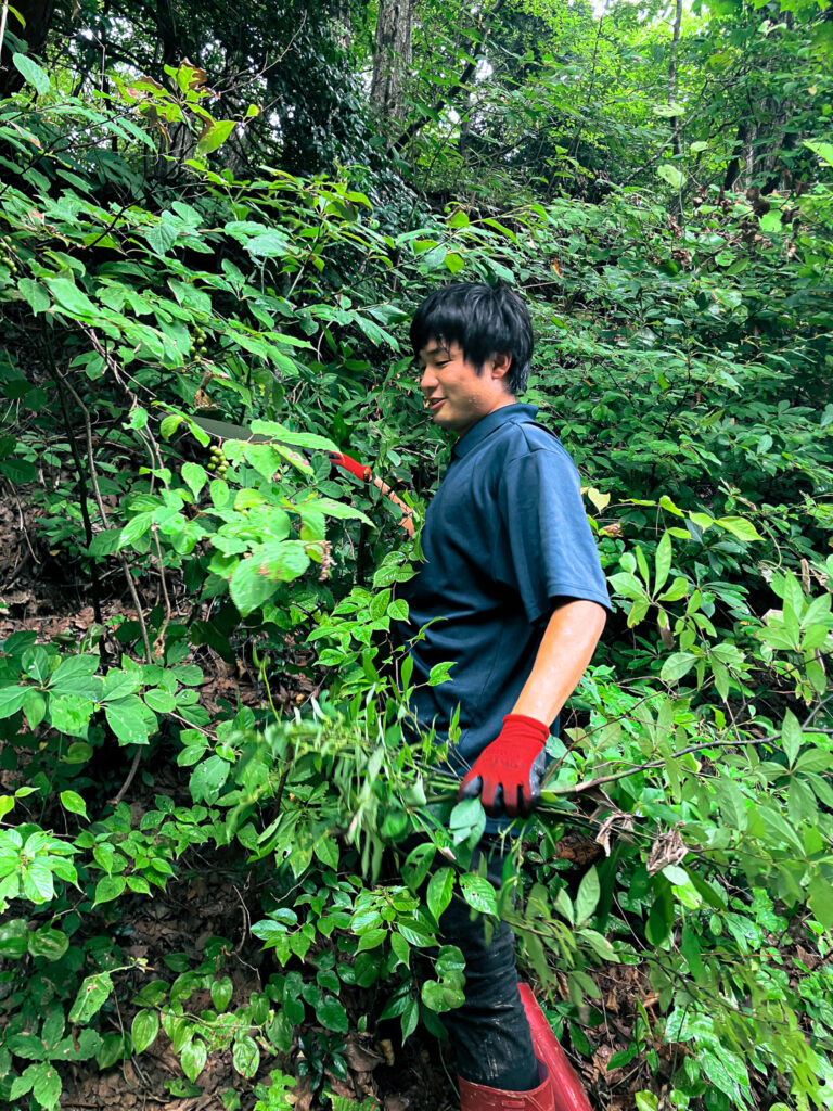 静かな山の中で、黙々とクロモジを収穫する農業チームの小林君。